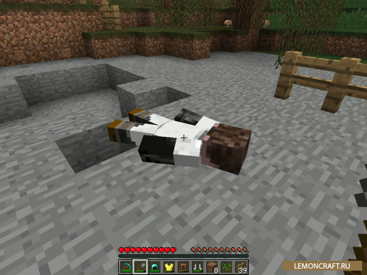 Мод Lootable Bodies позволяет получить ваши вещи, которые были при вас в момент вашей смерти. Для этого вам достаточно подойти к своему мертвому телу, нажать правую кнопку мыши и вы получите доступ к своему инвентарю. Ваше мертвое тело не подвержено никаким внешним воздействиям, поэтому его никто не сможет уничтожить, кроме вас. Что бы тело исчезло, нужно ударить по нему три раза лопатой. Не забудьте собрать дроп перед этим.